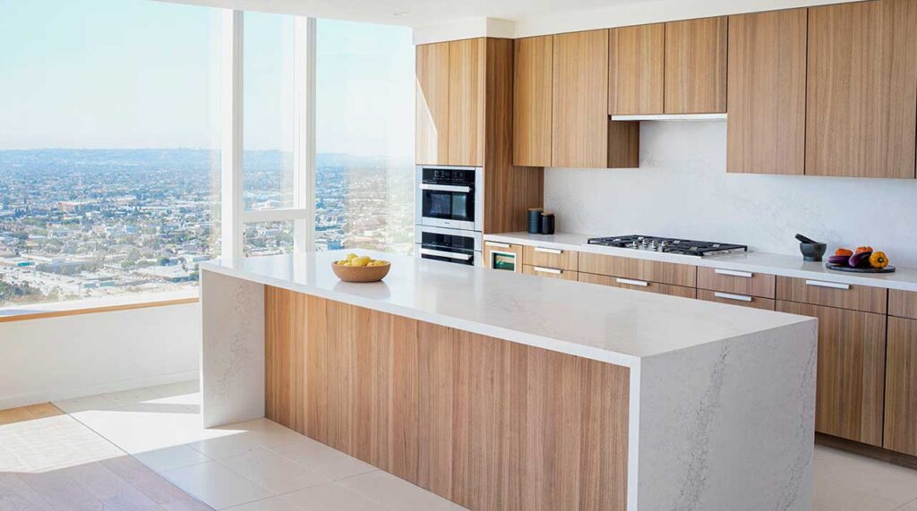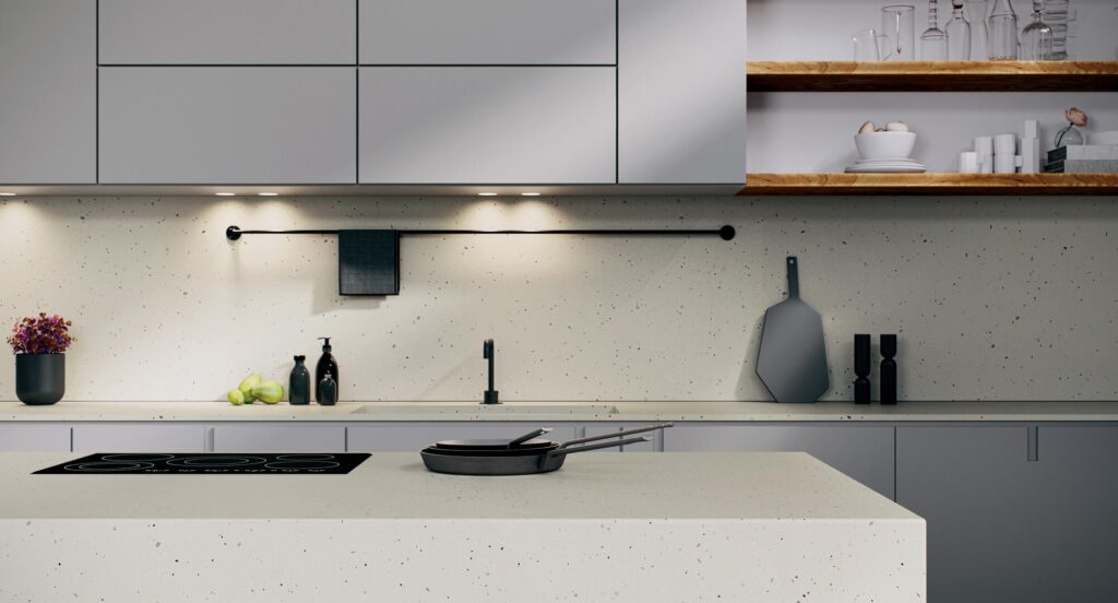 Another tip to expanding the look of your smaller kitchen is to blend your worktop, backsplash and even your island together with one material to create a modern waterfall effect. These blended surfaces are not only a solid foundation for your kitchen but will also create a unified flow throughout your space which will add a contemporary feel to the room. Opting for a pearl-white porcelain worktop, like 504 Lumena with its dark grey veining that rushes over its illuminated shell-like surface, will create a calming beam of light in the centre of your kitchen.