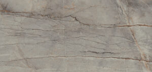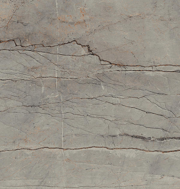 A smoky grey base weathered like a rock and fossil-like, a geological landscape that comes to life as a surface, its strong earthy presence reflected in a complex structure of fine dark veins at the centre alongside more prominent lines in other parts, emphasised by patina stains, rusted silt, chalky-white streaks, and burnt orange markings, in an Ultra-Rough finish.