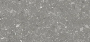 A gray terrazzo-like surface with a rich texture featuring flakes in varying shades of gray, beige, and white. The color combination creates a textured depth that projects luxury and elegance. In a Honed finish.